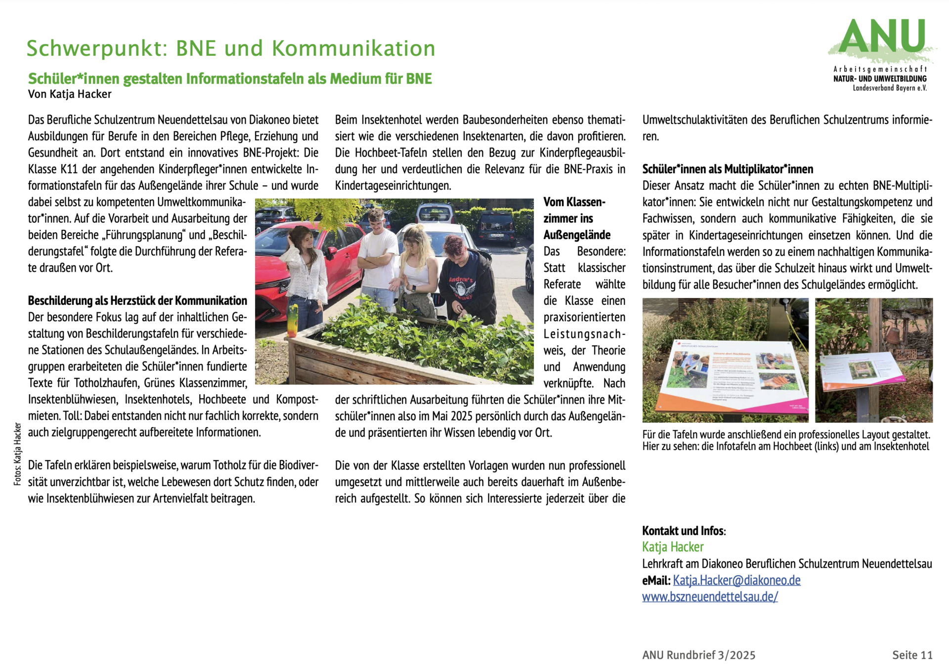 Im Rahmen unserer Zertifizierung als Umweltschule veröffentlichte die verantwortliche Lehrkraft, Frau Katja Hacker, einen Beitrag im Rundbrief der ANU Bayern zur Bildung für nachhaltige Entwicklung, Nr. 100, Ausgabe 3/2025, S. 10.