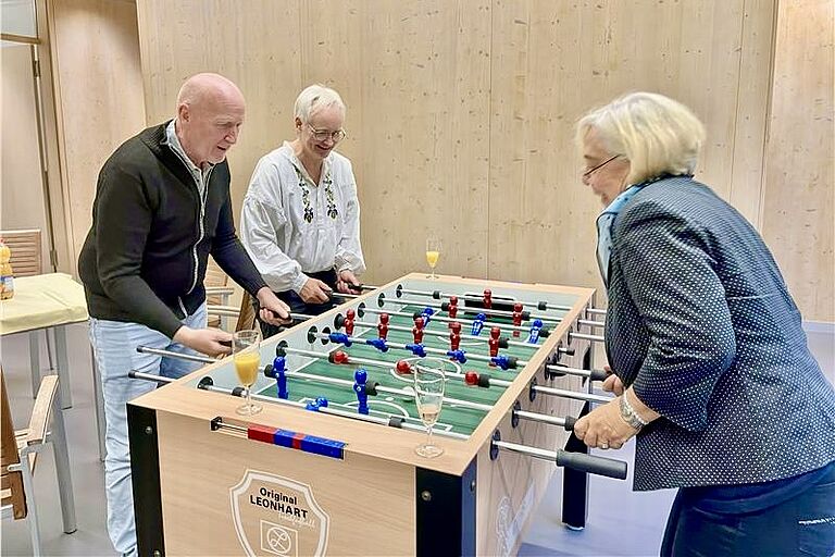 Alle Kolleginnen und Kollegen aus dem Hauptgebäude des BSZ waren eingeladen, um gemeinsam auf den Umzug anzustoßen. Mit Sekt, leckerem Essen und Musik der kleinen Lehrerband entstand eine fröhliche Atmosphäre. Besonders viel Freude bereitete ein kurzes Kicker-Spiel zwischen unserer Regionalleitung Frau Croner und Lehrkräften – ein erster Vorgeschmack auf das lebendige Miteinander im neuen Haus.